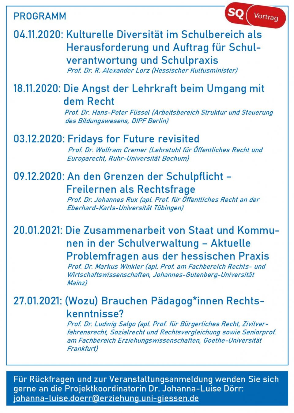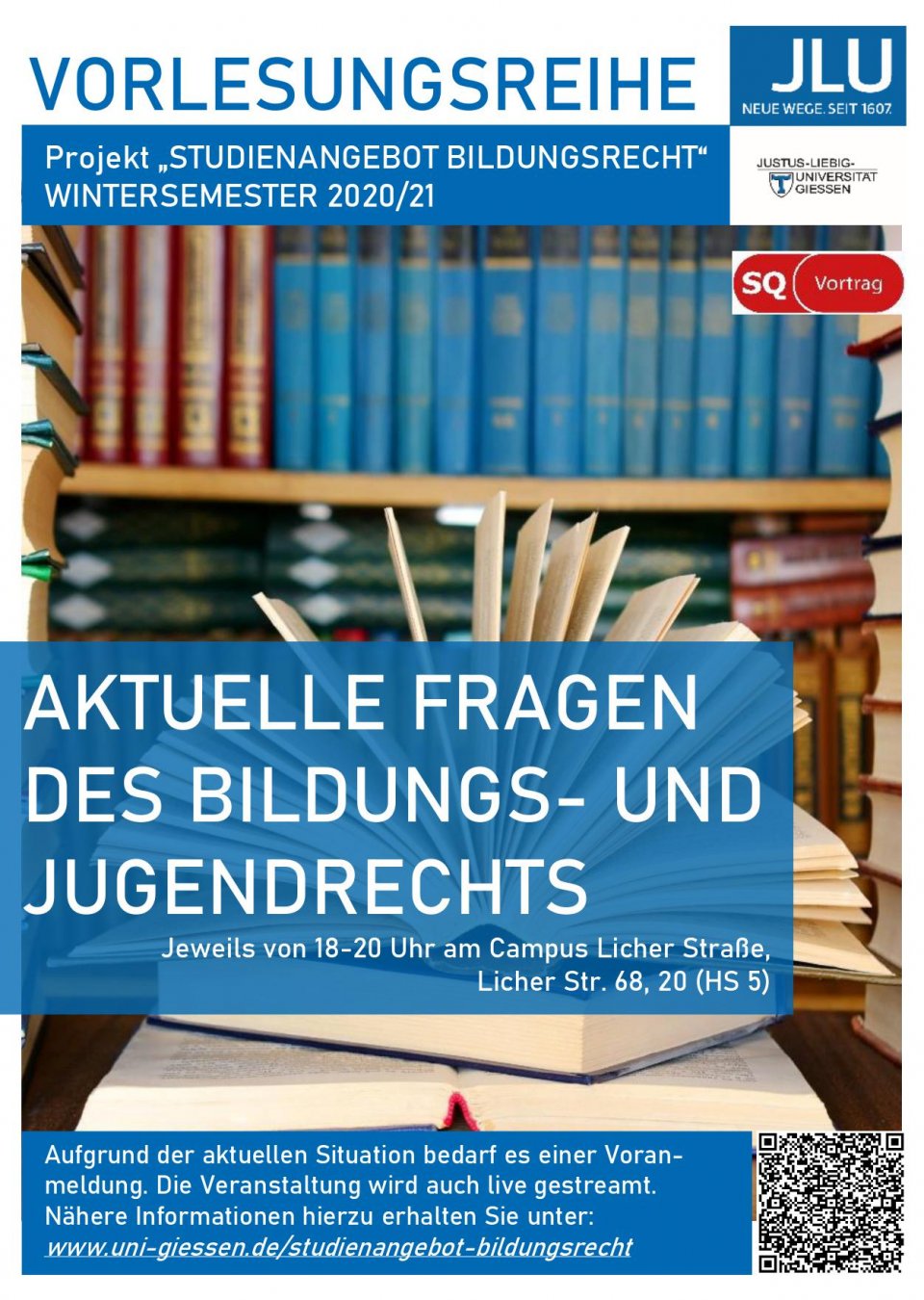 Die Vorträge finden jeweils von 18.15-19.45 Uhr im Hörsaal 5 (Campus Licher Straße – Licher Str. 68, 20) statt. Für die digitale Teilnahme wie auch eine Teilnahme in Präsenz bedarf es einer kurzen Voranmeldung per E-Mail an die Projektkoordinatorin Dr. Johanna-Luise Dörr: johanna-luise.doerr@erziehung.uni-giessen.de. Weitere Informationen zur Vorlesungsreihe sowie zum Projekt selbst finden Sie unter: www.uni-giessen.de/studienangebot-bildungsrecht.