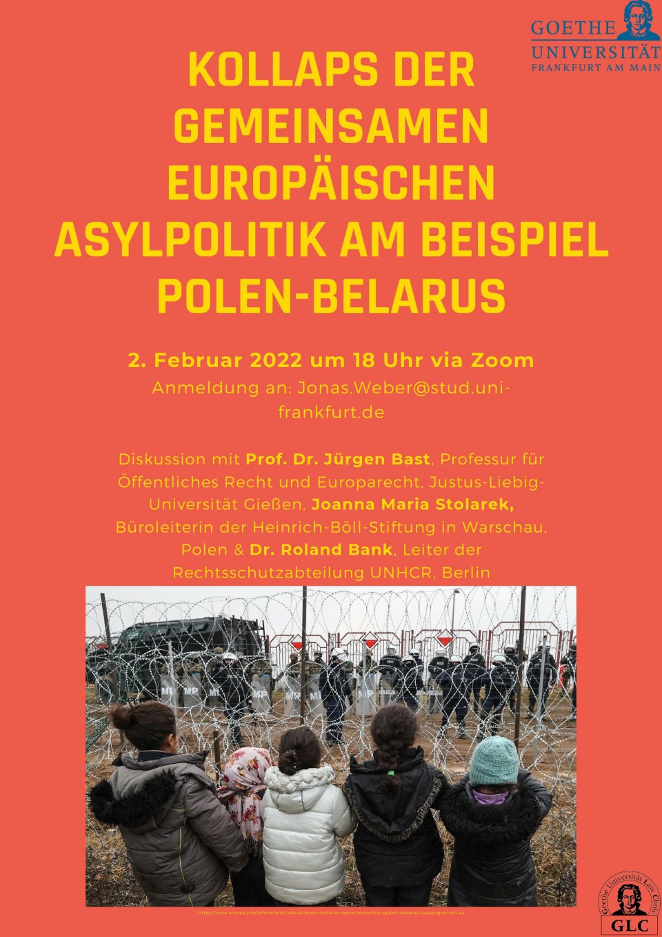 Während Joanna Maria Stolarek zu Beginn der Veranstaltung aus Warschau über die tatsächliche Situation an der polnischen Grenze und die Reaktionen der polnischen Gesellschaft berichtet, wird Prof. Dr. Jürgen Bast über die europäische Asylpolitik und ihre Herausforderungen sprechen, sowie die Situation an der Grenze völker- und asylrechtlich bewerten. Zudem wird Dr. Roland Bank, Leiter der Rechtsschutzabteilung UNHCR, Berlin, referieren.