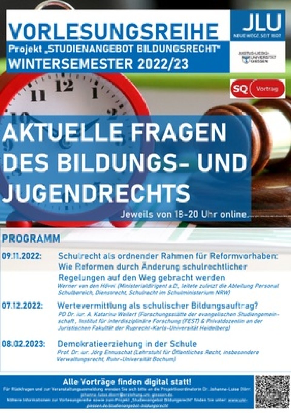 Wie gewohnt werden jeweils mittwochs 18:15–19:45 Uhr Expert*innen aus der Rechtswissenschaft zu aktuellen schul-, bildungs- und jugendrechtlich relevanten Themen referieren, jeweils anschließend besteht die Möglichkeit zur gemeinsamen Diskussion. Die Teilnahme ist auf SQ-Vortrag anrechenbar.
