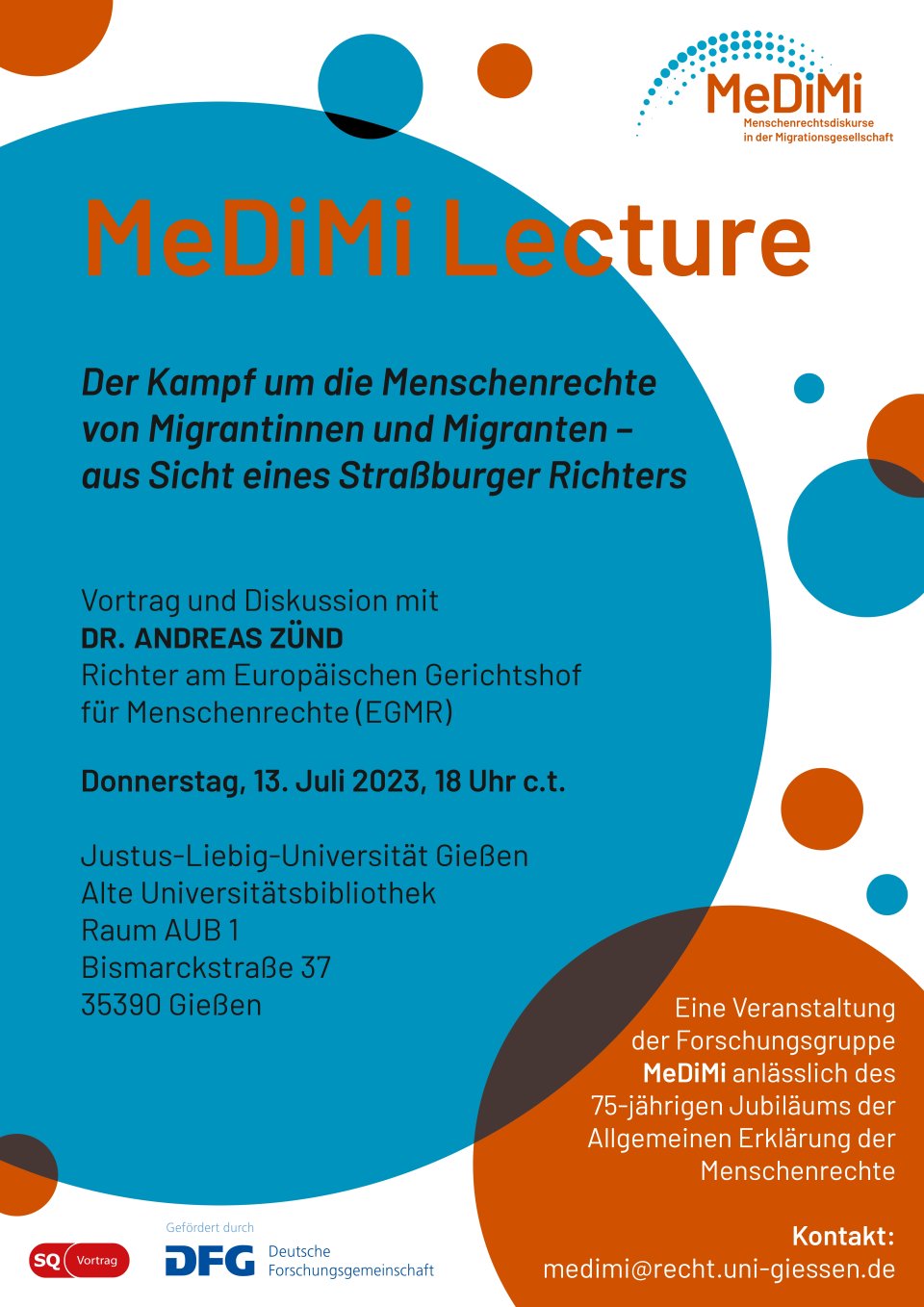 Die Forschungsgruppe „Menschenrechtsdiskurse in der Migrationsgesellschaft“ (MeDiMi) lädt Sie herzlich zur ersten MeDiMi Lecture anlässlich des 75-jährigen Jubiläums der Allgemeinen Erklärung der Menschenrechte ein. Die Forschungsgruppe freut sich, den Schweizer Richter am Europäischen Gerichtshof für Menschenrechte Dr. Andreas Zünd zu Vortrag und Diskussion begrüßen zu dürfen. Dr. Zünd spricht zum Thema „Der Kampf um die Menschenrechte von Migrantinnen und Migranten – aus der Sicht eines Straßburger Richters“.