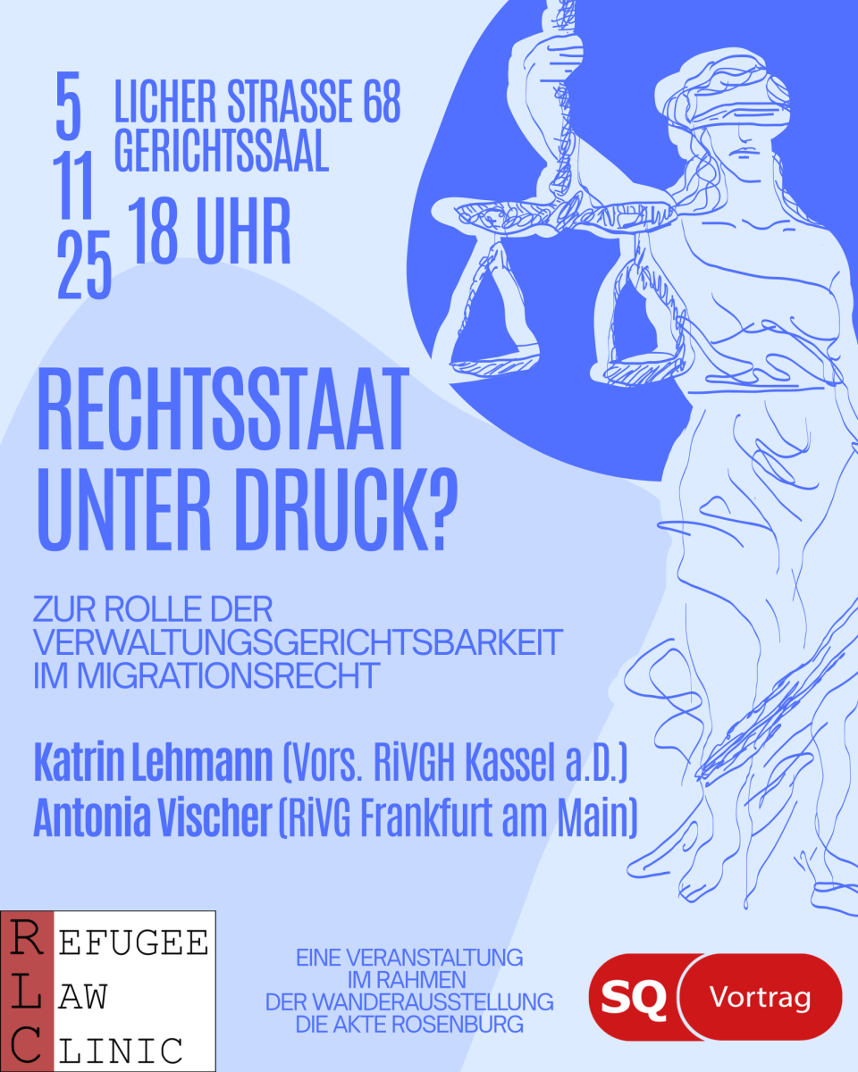 Die Refugee Law Clinic Gießen (RLC) lädt am 5.11.25 um 18 Uhr im Gerichtssaal (Licher Strasse 68) zu einer Veranstaltung mit Katrin Lehmann (Vors. RiVGH Kassel a.D.) und Antonia Vischer (RiVG Frankfurt am Main) unter dem Titel "Rechtsstaat unter Druck? Zur Rolle der Verwaltungsgerichtsbarkeit im Migrationsrecht" ein.
