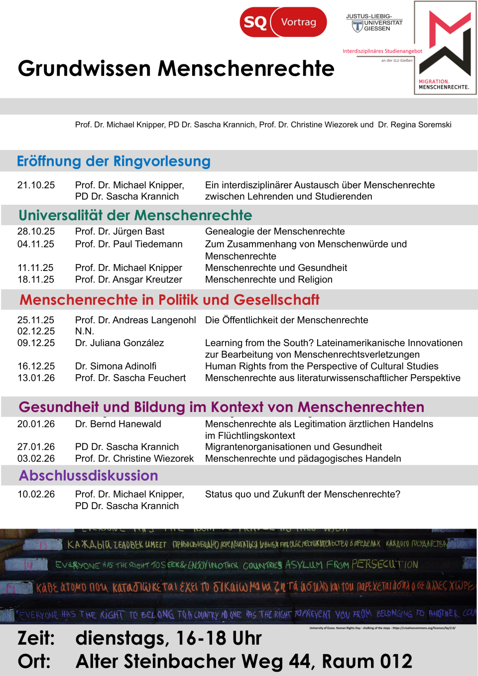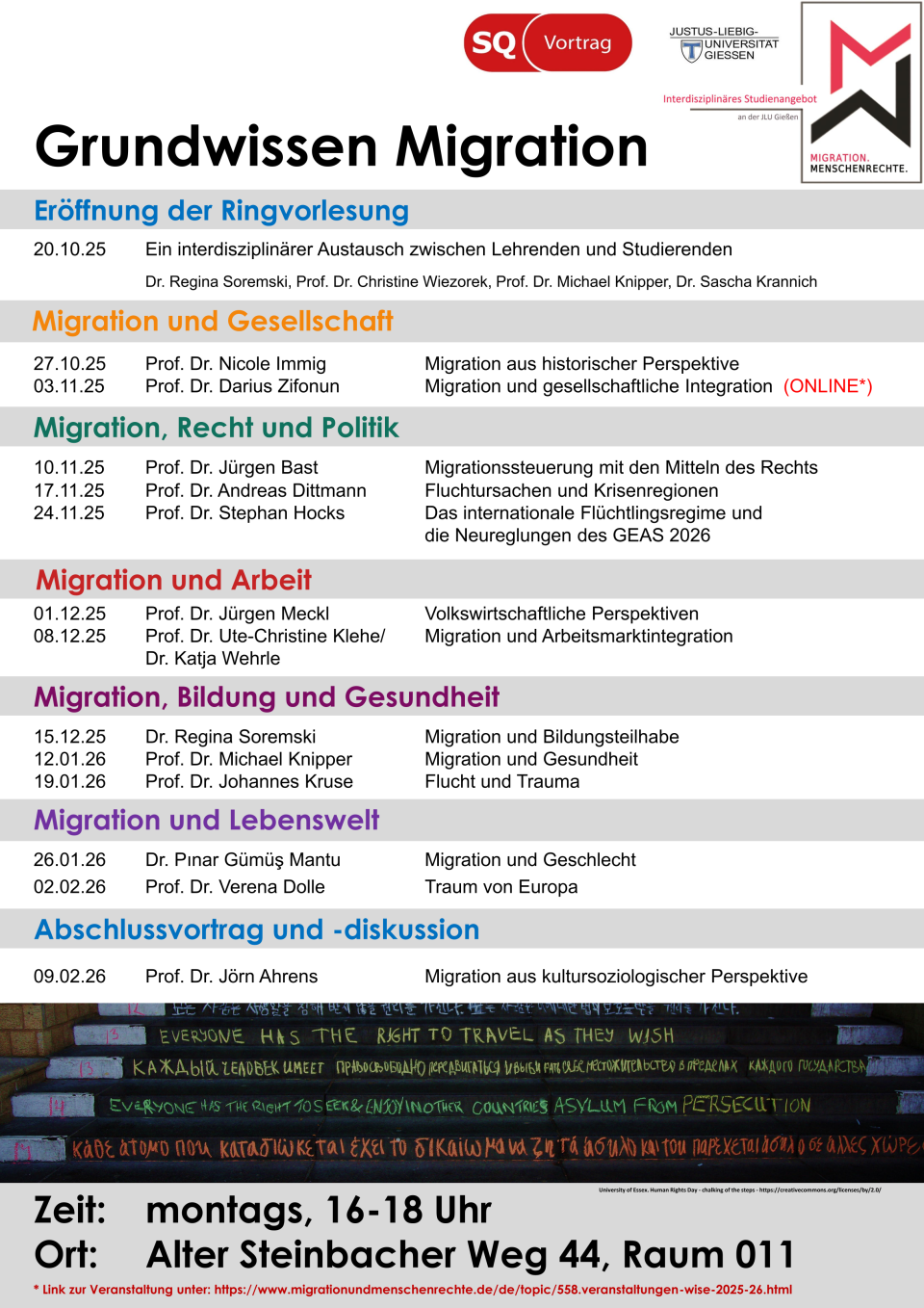 In den Ringvorlesungen "Grundwissen Migration" (montags, 16:15–17:45 Uhr, Raum 011) und "Grundwissen Menschenrechte" (dienstags, 16:15–17:45 Uhr, Raum 012) stellen Expert*innen die Themen Migration und Menschenrechte mit ihren jeweiligen unterschiedlichen disziplinären Zugängen vor. Die beiden Räume befinden sich im Alter Steinbacher Weg 44.