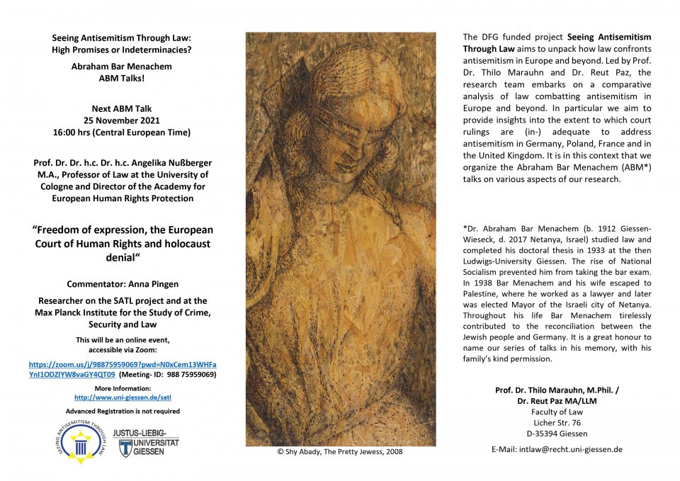 Die ABM Talks finden im Rahmen des DFG-geförderten Projekts "Seeing Antisemitism Through Law: High Promises or Indeterminacies?“ (Leitung: FGMM-Mitglied Prof. Dr. Thilo Marauhn und Dr. Reut Paz) statt.